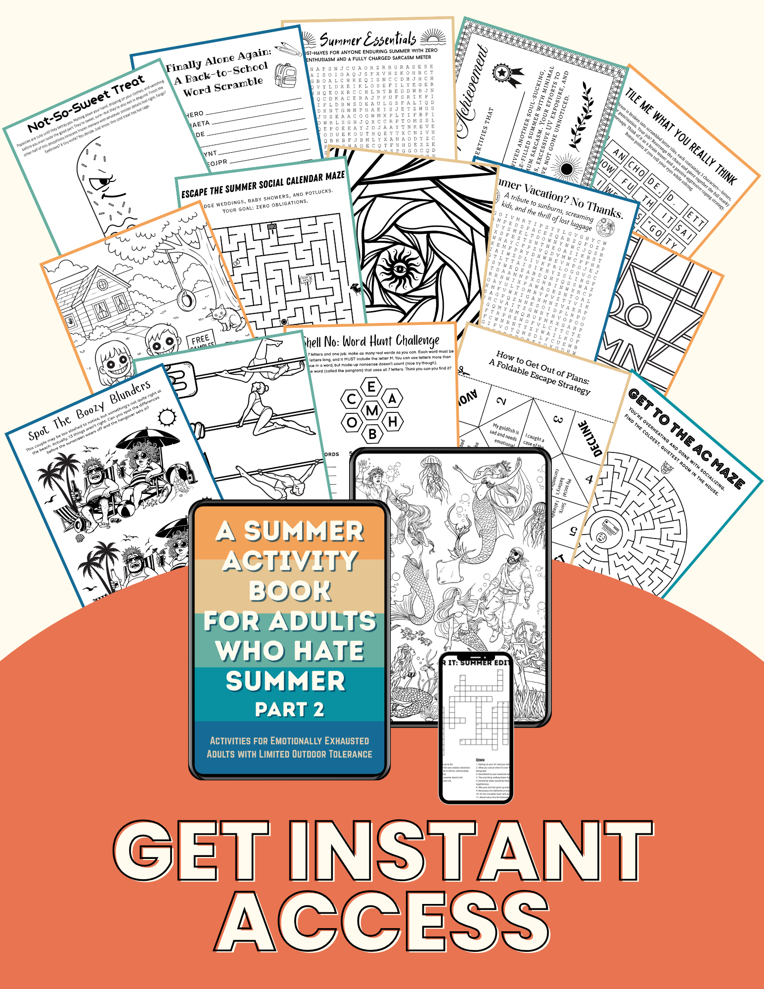 Because one snarky summer activity book just wasn’t enough. A Summer Activity Book for Adults Who Hate Summer – Part 2 doubles down on the sarcasm, shade, and sunburn-level burn you loved in the first one. Packed with even more profanity-laced puzzles, cynical coloring pages, and “fun” activities that make you feel seen, this follow-up is here to help you survive the heat—and the people—until fall finally rescues us all.
