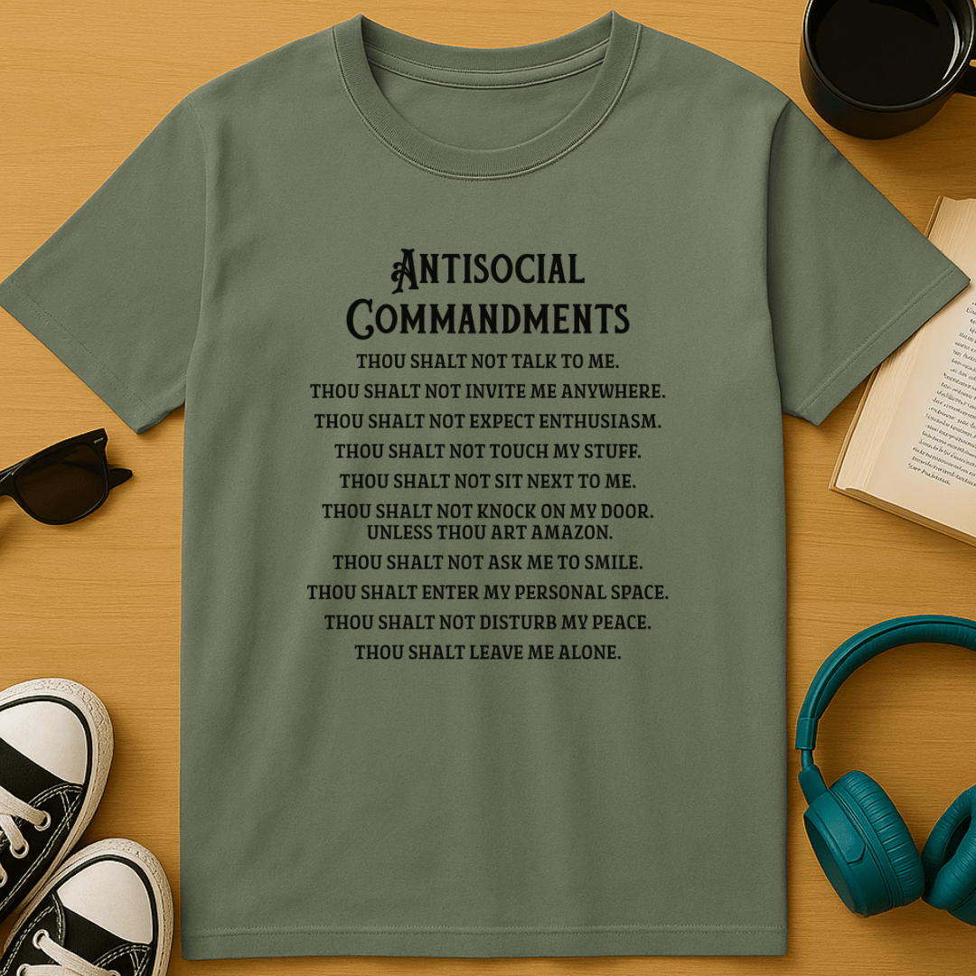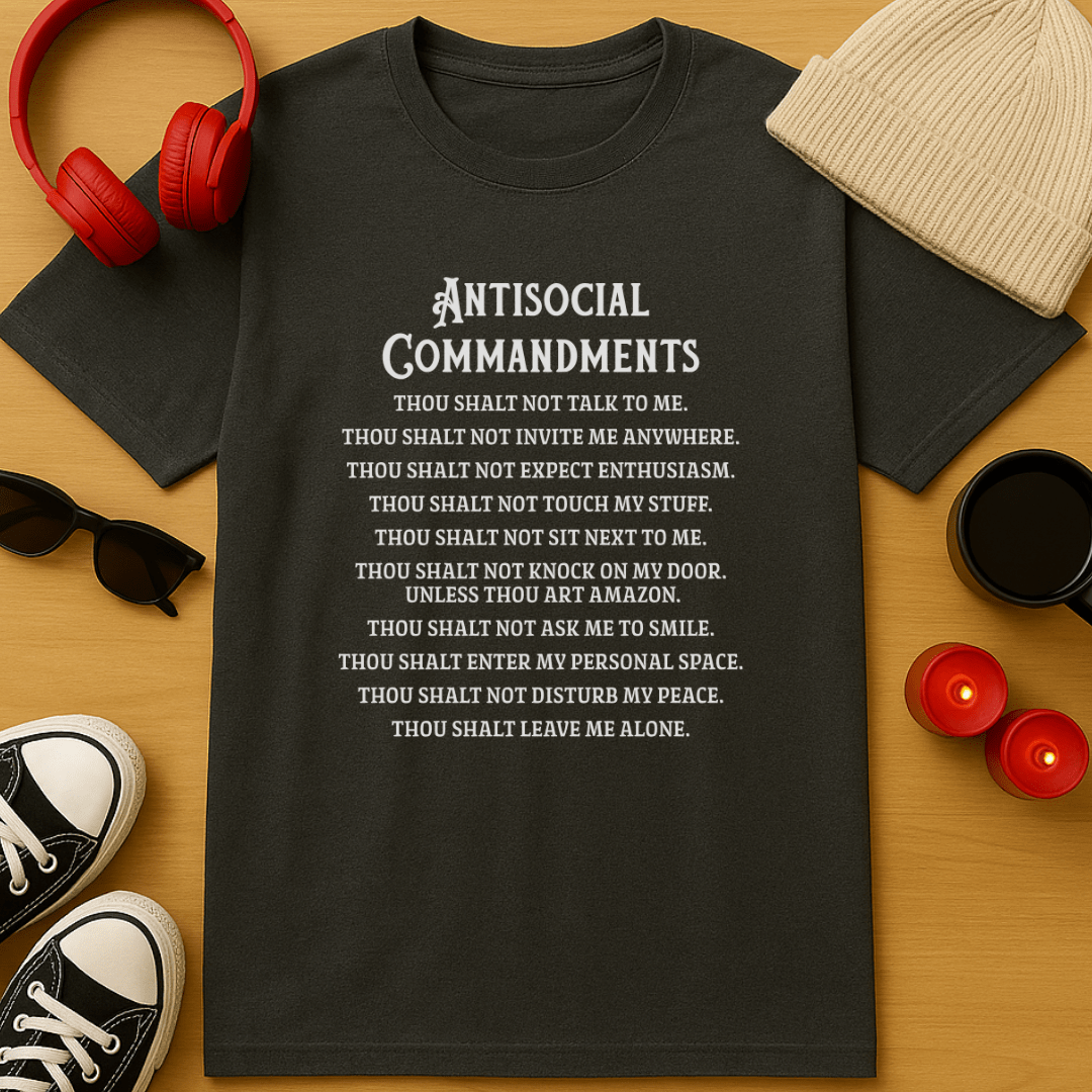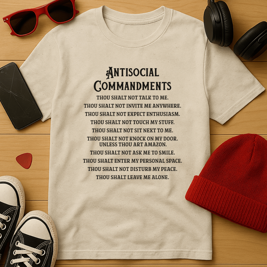 This shirt isn’t just a vibe—it’s a doctrine. Straight from the antisocial gospel, this design lays down the law for anyone who dares breach your personal space. This sacred scroll of sarcasm doubles as a divine warning: blessed are the boundary-havers, for they shall inherit the couch. Each commandment is delivered not from a mountaintop, but from the comfort of bed with a blanket over your head and notifications turned off.