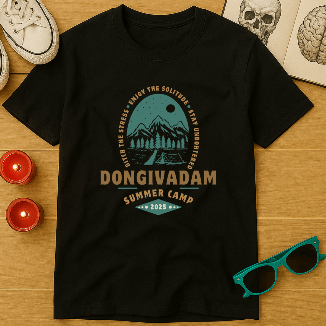 Finally, a summer camp for the emotionally unavailable. Welcome to Camp Dongivadam—where we ditch the stress, enjoy the solitude, and stay unbothered on purpose. This retro-style design is a badge of honor for anyone that canceled plans to sit in silence and felt nothing but joy.