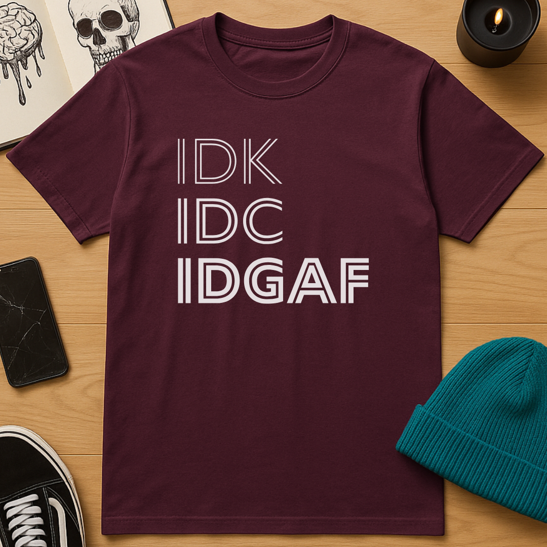 Made from soft, lightweight, and breathable cotton, this shirt has that perfect lived-in feel without looking like you just rolled out of bed (even if you did). The classic fit and crew neckline make it easy to pair with anything—jeans, sweats, or the quiet satisfaction of not explaining yourself. Wear it to work, to brunch, or to absolutely nowhere. Either way, the message is clear: IDK. IDC. IDGAF.